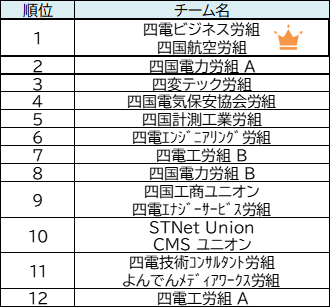 | 見事優勝に輝いた「四電ビジネス労組・四国航空労組」合同チーム! |