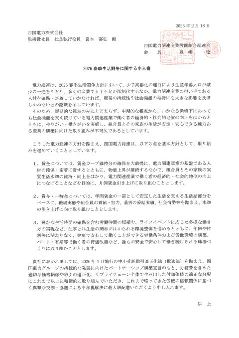 | 四国電力総連は、2026春季生活闘争を進めるにあたり、電力総連との連携を図りながら検討を重ね、第10回執行委員会(令和8年2月6日(金)開催)において、2026春季生活闘争方針を決定した。この方針に基づき、電力総連統一要求日である2月18日(水)に各加盟組合が経営側に対して要求書を提出し、今次交渉をスタートした。 同日、四国電力総連として、四国電力株式会社に対し、「パートナーシップ構築宣言」の趣旨を踏まえた適切な価格転嫁と取引の適正化を求めるとともに、労使の信頼関係に基づく春季生活闘争の平和裏解決への最大限の配慮について申し入れを行った。 今後は、各加盟組合で4月末までの解決をめざし、精力的に交渉を展開するとともに有利解決を図れるよう取り組みを強化することとしている。 |